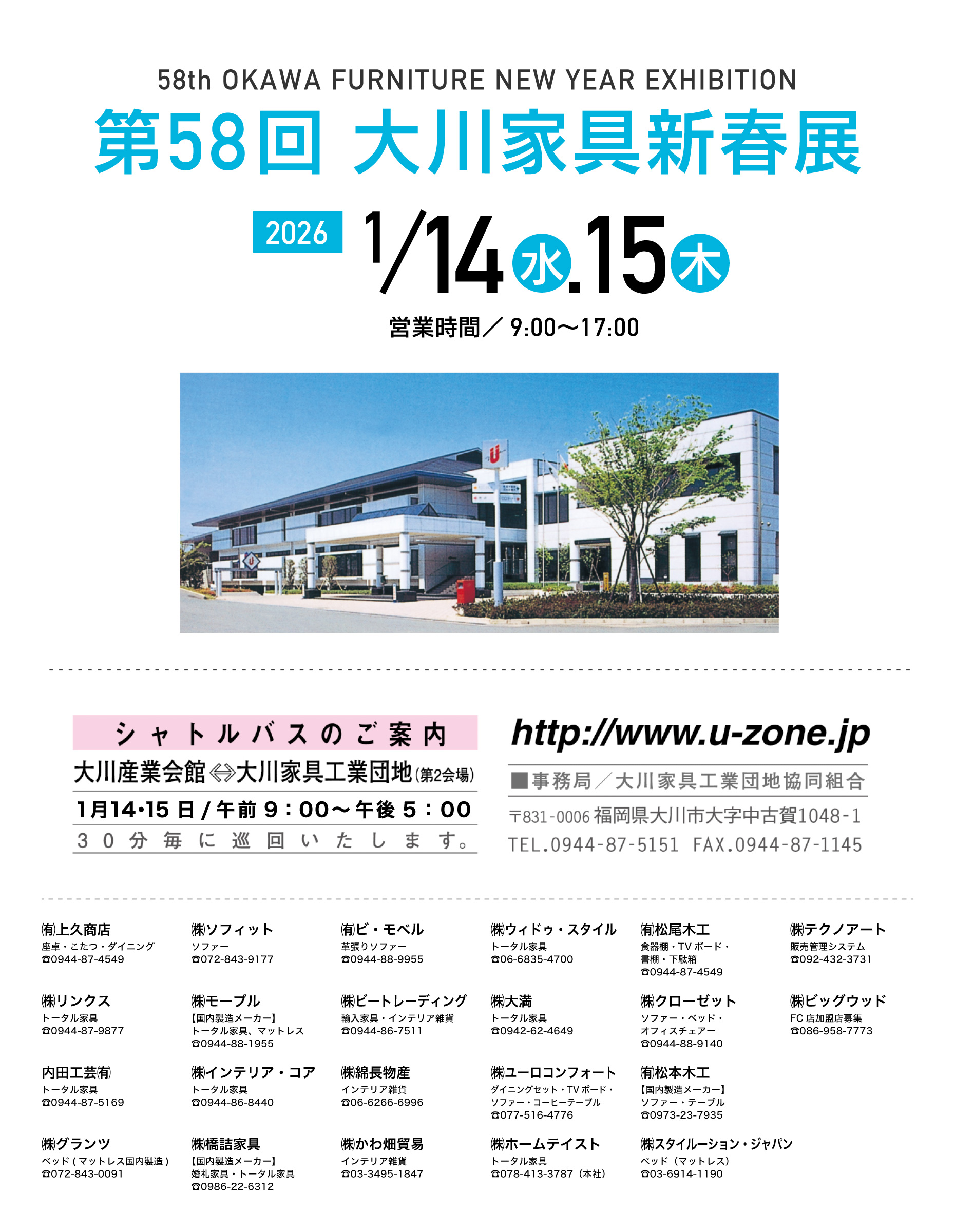 大川家具工業団地協同組合 〒831-0006 福岡県大川市大字中古賀1048-1TEL:0944-87-5151(代)FAX:0944-87-1145u-zone@u-zone.jp